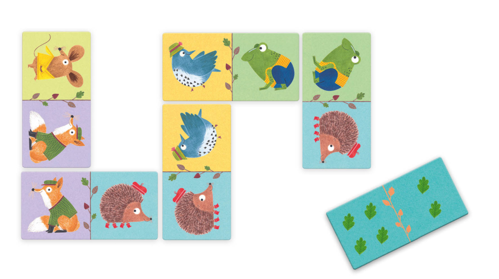 Prikladaj dielik k dieliku, skladaj krásnu lesnú cestičku. Domino je obojstranné. Hľadaj rovnaké farby a zvieratká alebo domino otoč a hľadaj rovnaký počet listov.