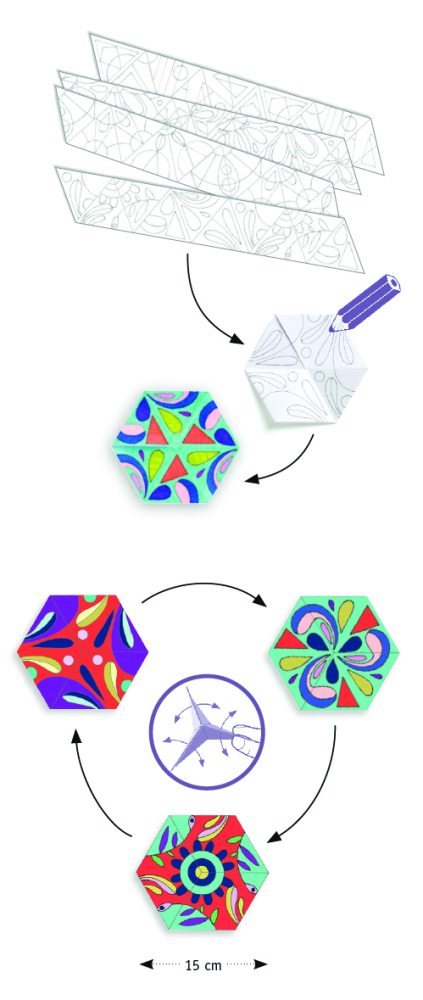 Sada Ružicové mandaly v sebe spája vyfarbovanie, skladanie a hru. Obsahuje 4 papierové prúžky so vzormi na vyfarbenie. Vyfarbené prúžky poskladáš do šesťuholníka, ktorý má farebnú nielen vrchnú a spodnú stranu, ale aj vnútornú. Zatlačením jednotlivých častí šesťuholníka k sebe a ich následným otvorením (prevrátením) sa ukáže ďalšia strana šesťuholníka – ďalší obrázok. Premieňanie obrázkov pripomína hru s kaleidoskopom. Tak ako je pre mandaly typické, sú obrázky na šesťuholníkoch symetrické. Keď sa ti podarí súmerne usporiadané geometrické tvary precízne vyfarbiť, budú tvoje ružicové mandaly dokonalé.
